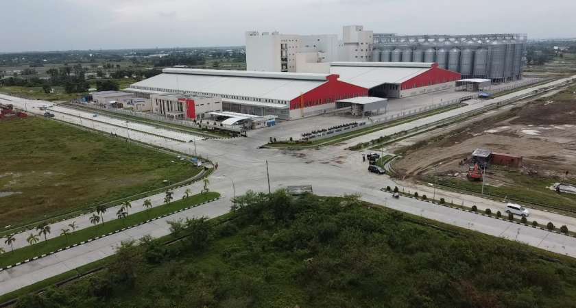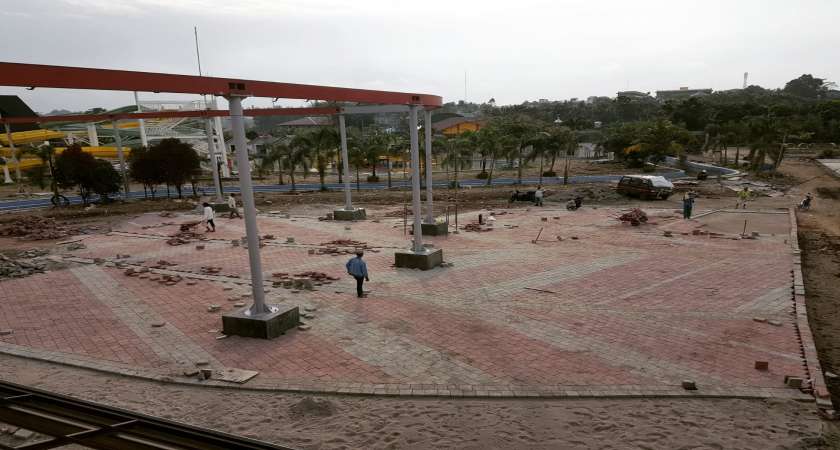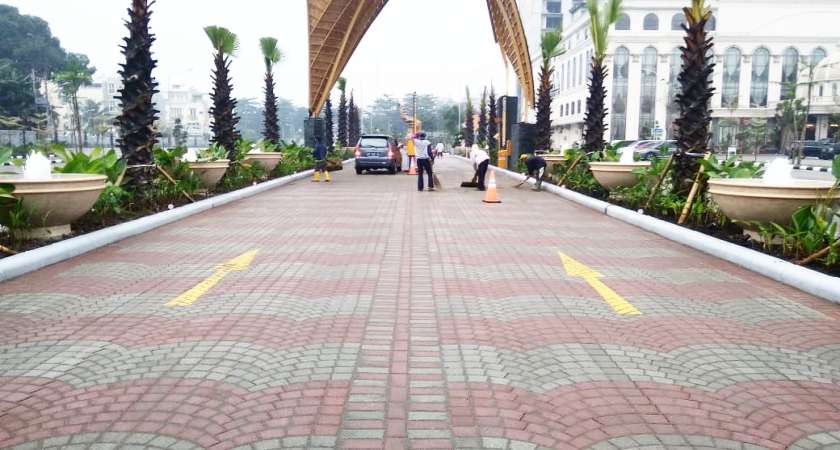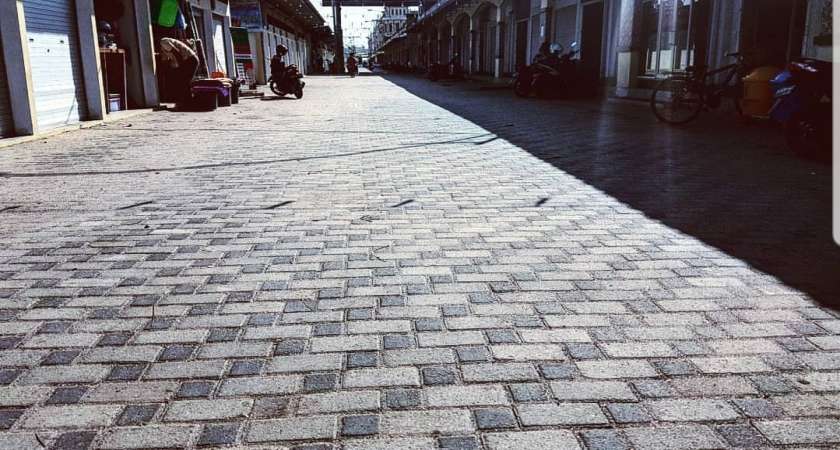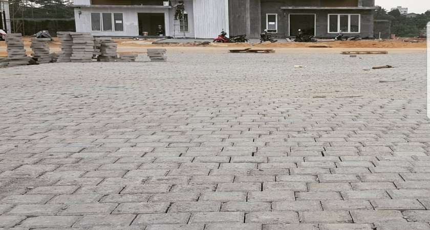 Paving dengan motif gelombang variasi warna merah dan polos semen